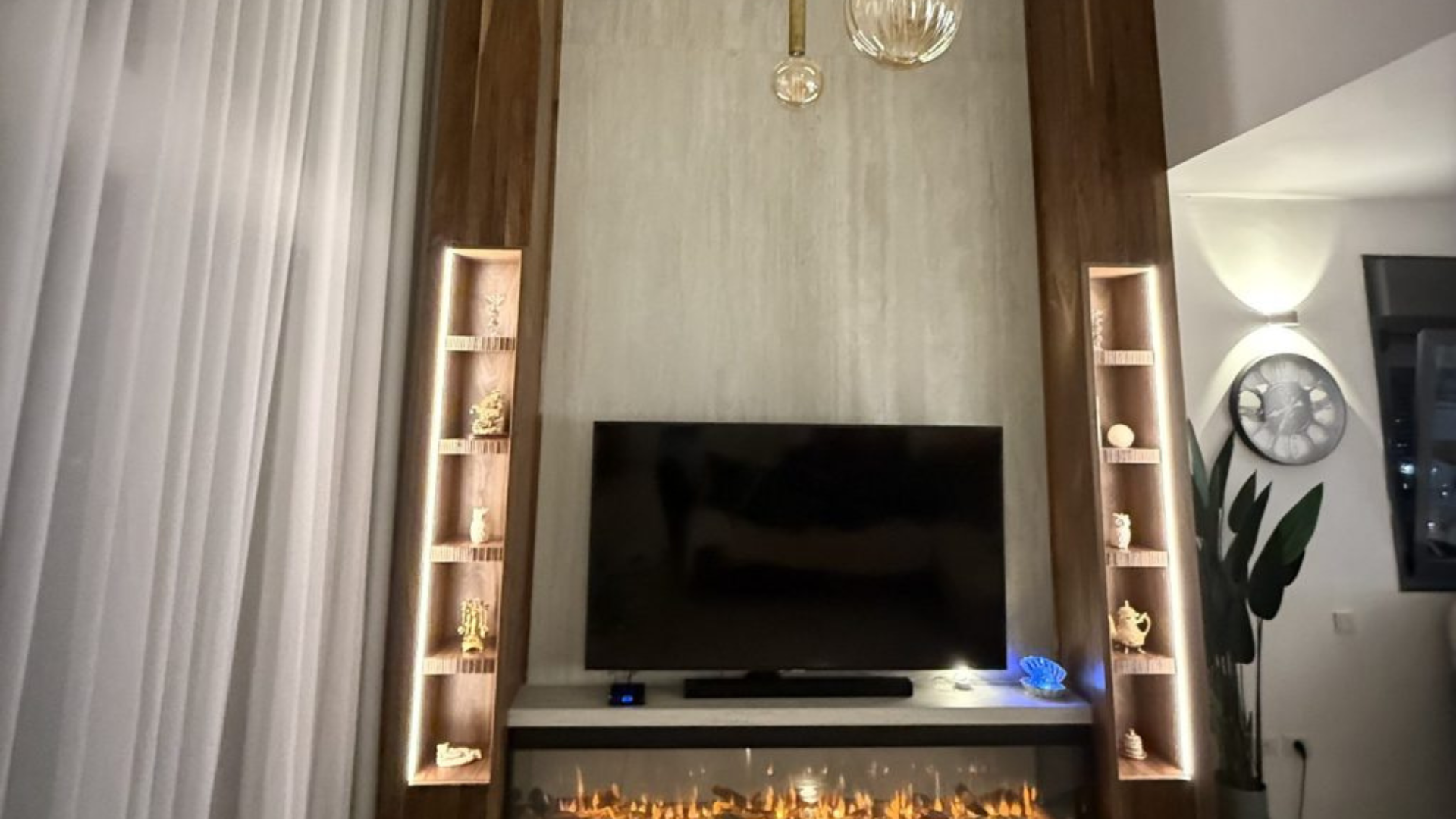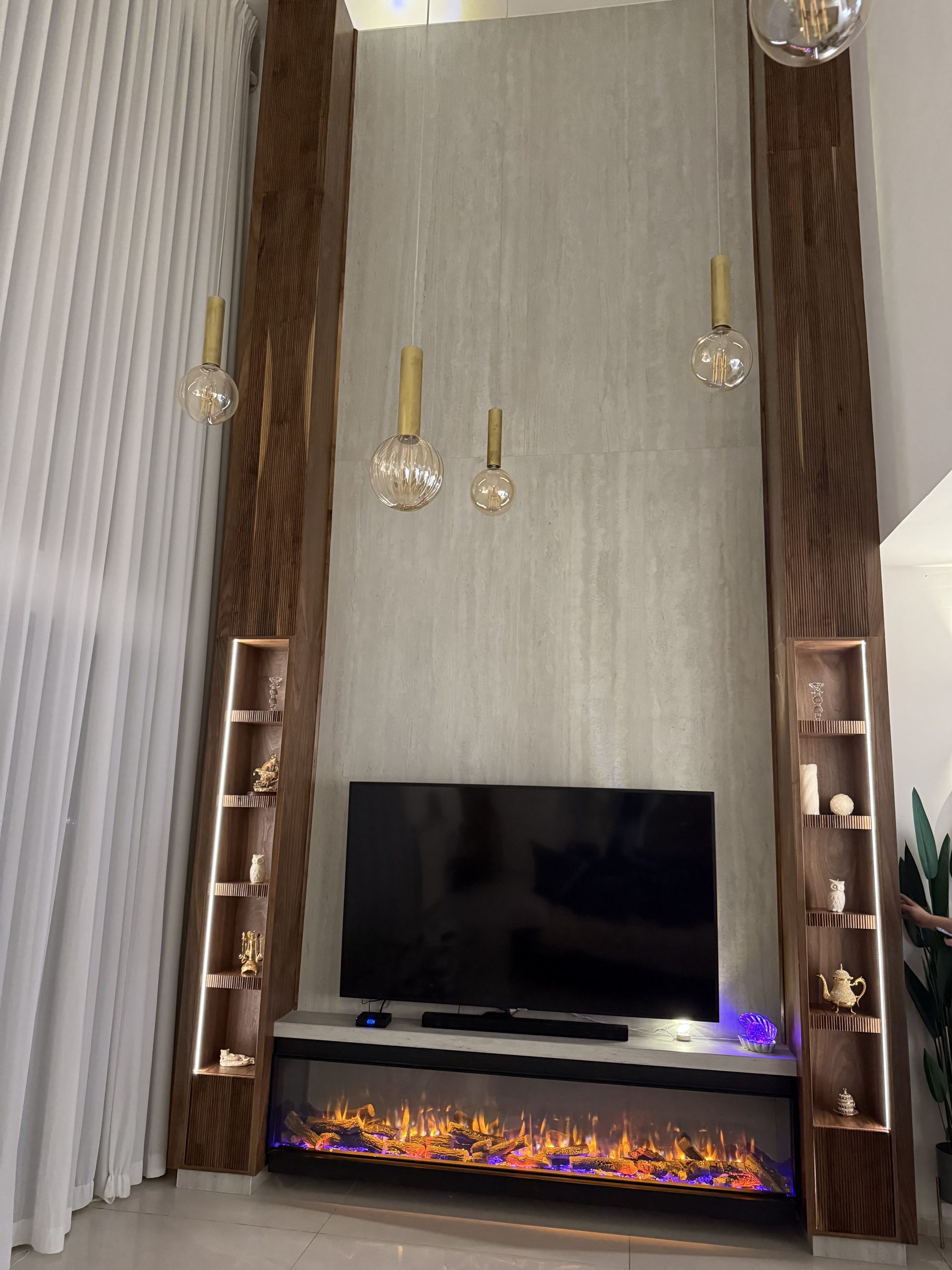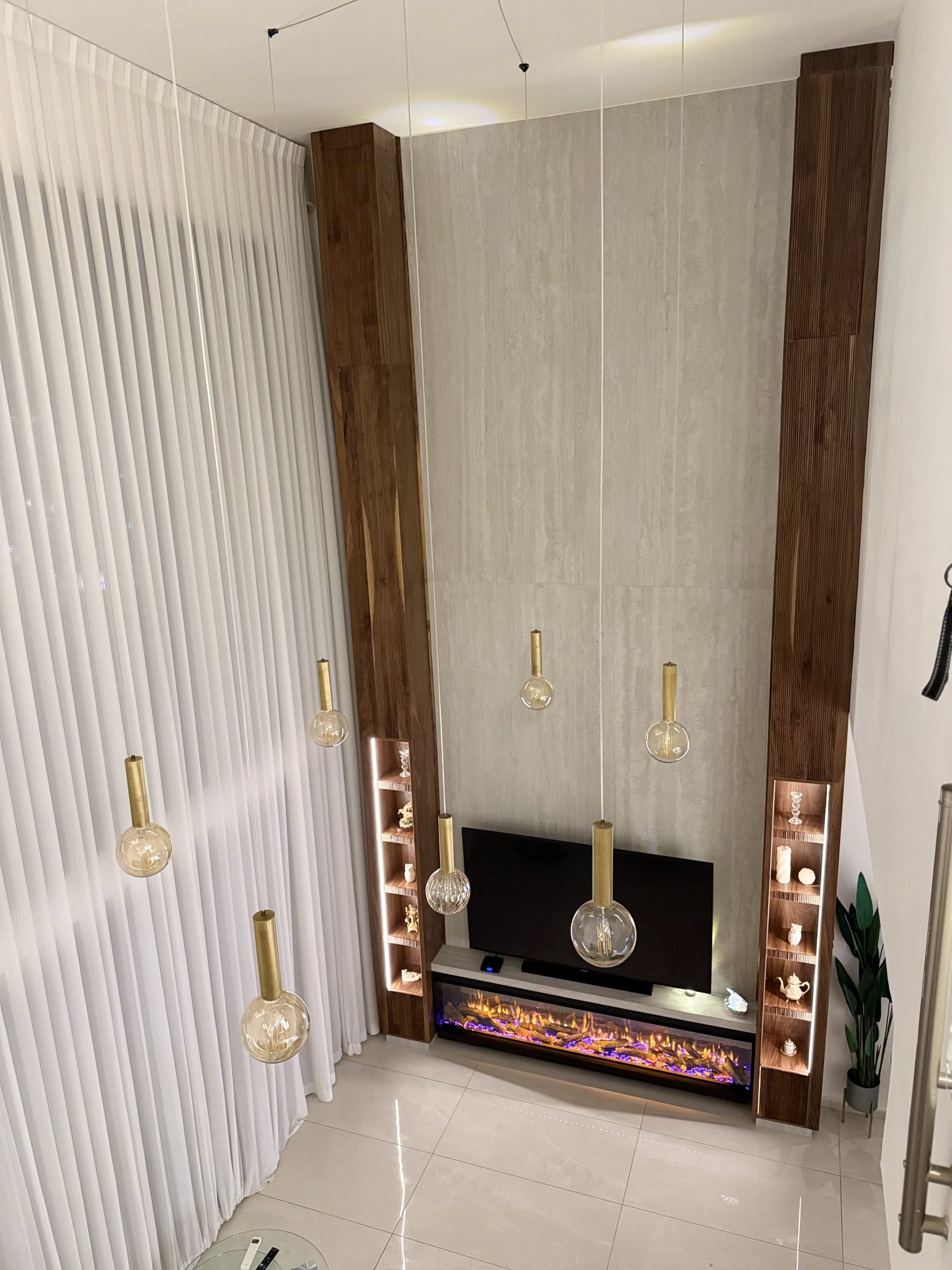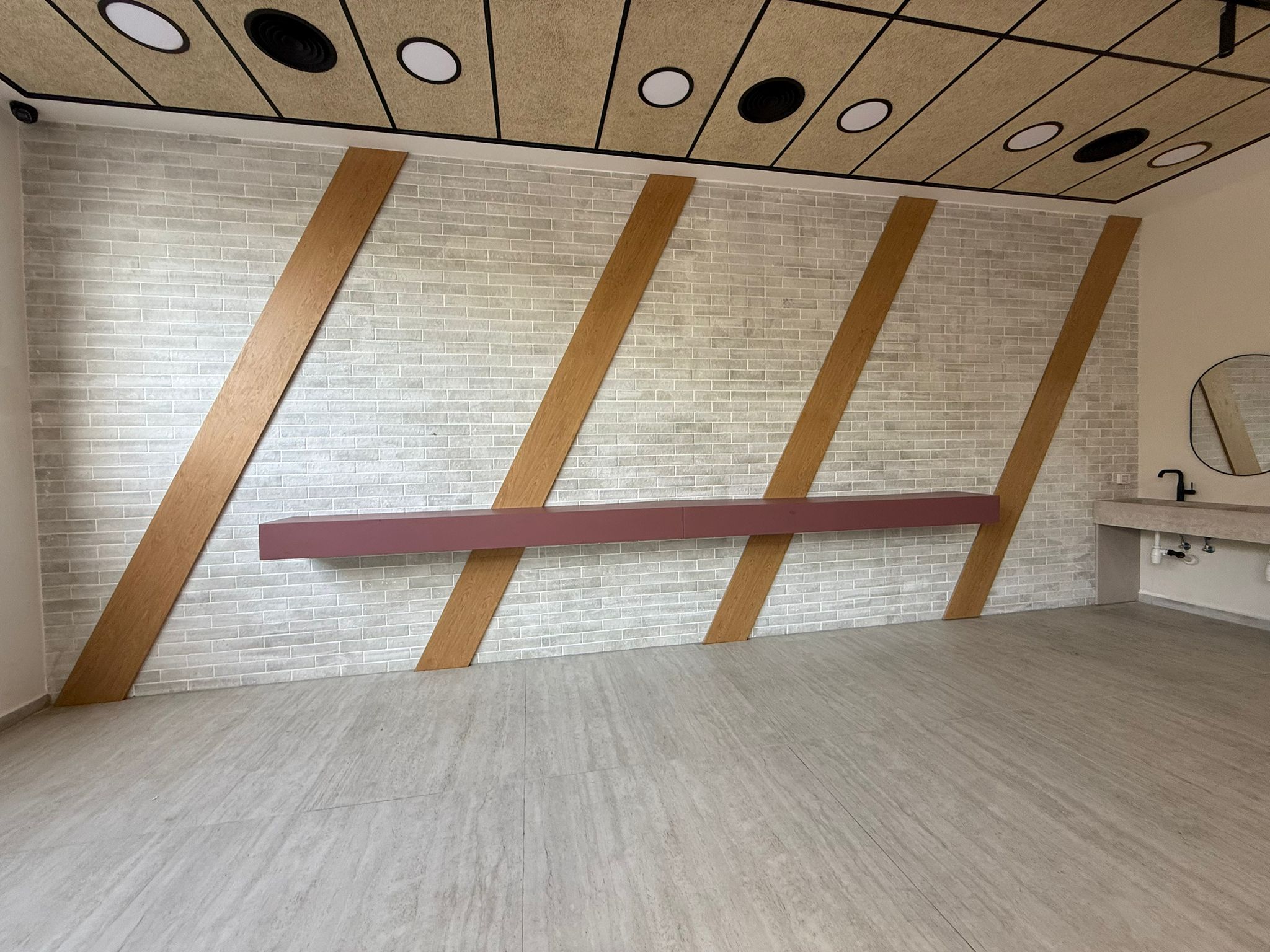 הקיר, המתנשא לגובה של 6 מטרים, משלב חיפוי עץ וקרמיקה בגוונים וחומרים שמתחברים לאופי החלל – יוקרתי, נקי ומאופק.