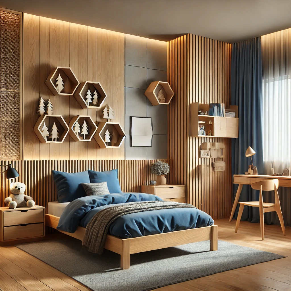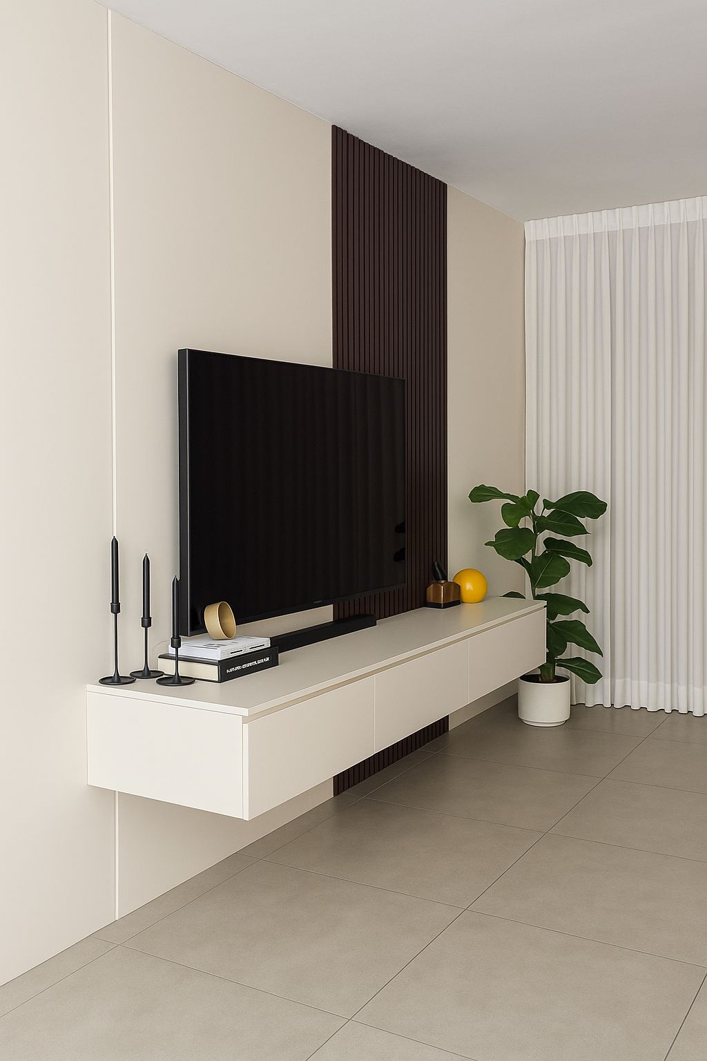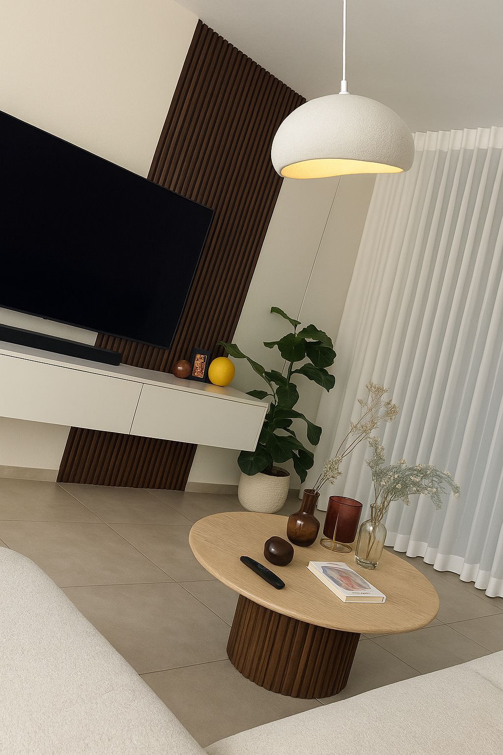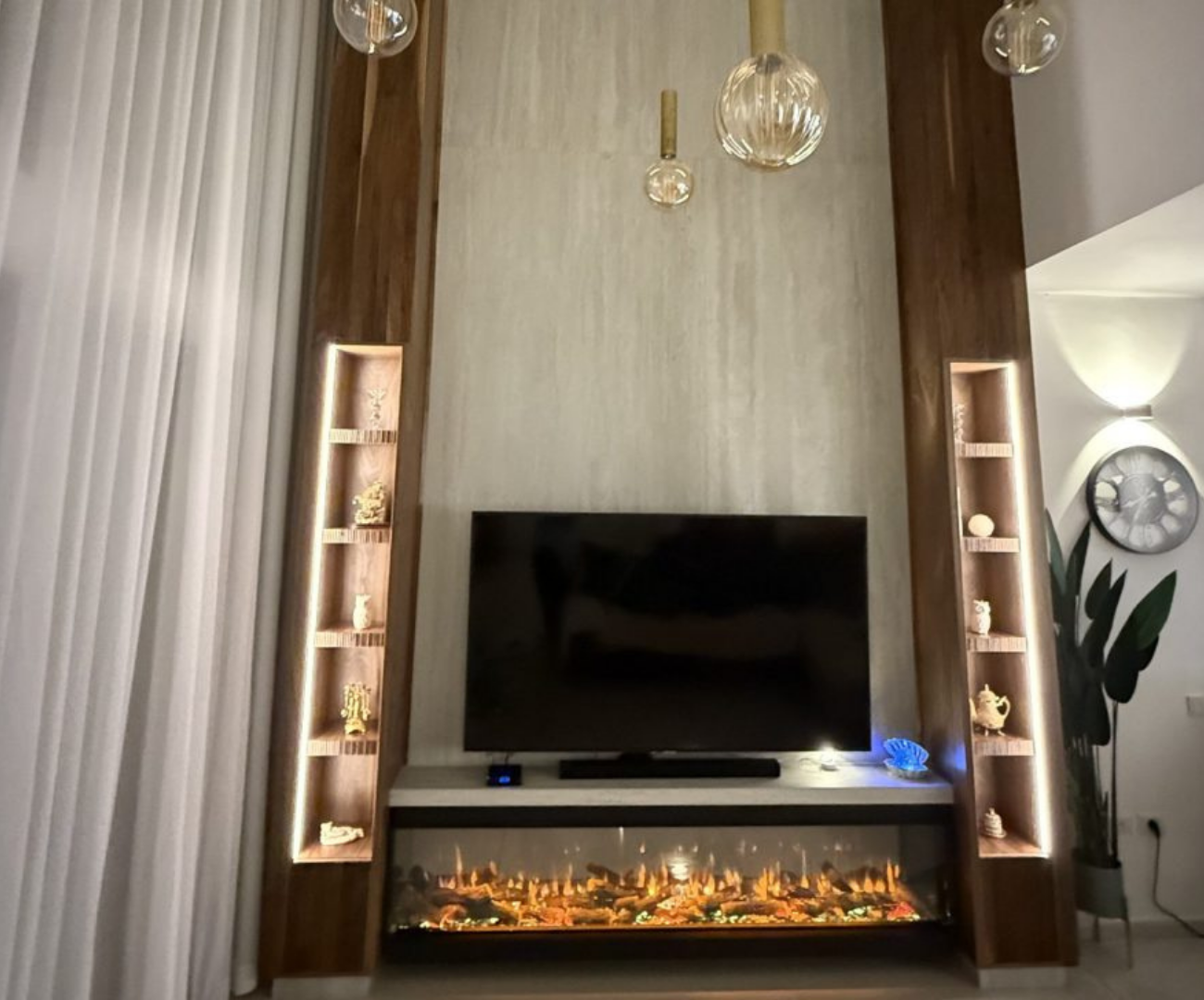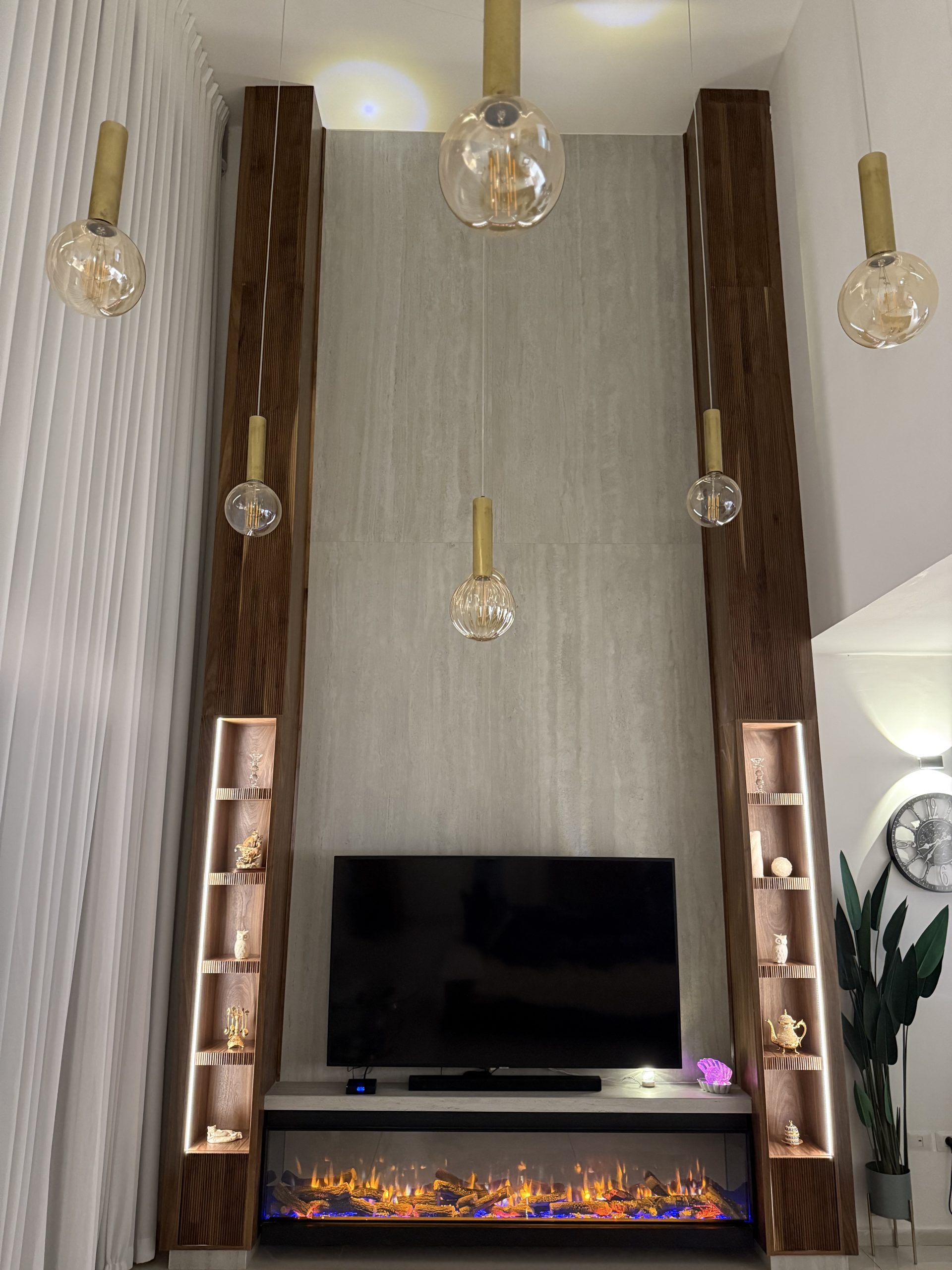הקיר, המתנשא לגובה של 6 מטרים, משלב חיפוי עץ וקרמיקה בגוונים וחומרים שמתחברים לאופי החלל – יוקרתי, נקי ומאופק.